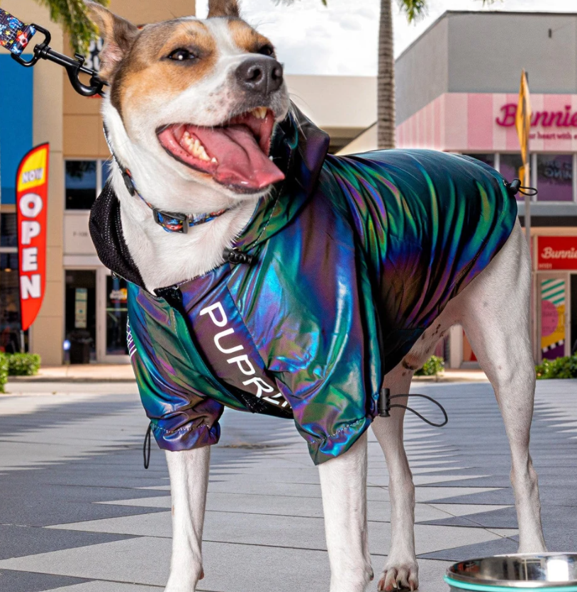 I love this hyper-reflective material. In normal light it looks like a nice dark purple/gray but when there’s a bright light on it it luminates a bright yellow/pink vibe. This is super cute for those puppies to go outside in the rain and stay a little more dry. Titanium Flare